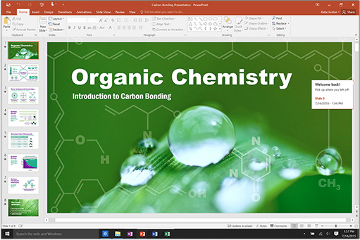 通過全新的幻燈片切換和改進的動畫任務窗格創建、協作和高效展現自己的思路。幻燈片旁邊按線索組織的備注幫助您將反饋融入到演示文稿。 此外,演示者視圖在Mac 上顯示當前幻燈片、下一張幻燈片、備注文稿以及計時器,同時僅在大屏幕上向您的觀眾投影演示文稿。