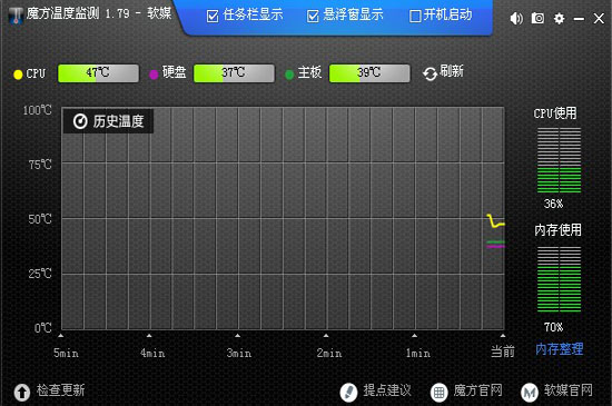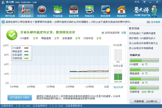 在溫度監測內,魯大師顯示計算機各類硬件溫度的變化曲線圖表。溫度監測包含以下內容(視當前系統的傳感器而定):CPU溫度、顯卡溫度(GPU溫度)、主硬盤溫度、主板溫度、風扇轉速。 勾選設備圖標左上方的選擇框可以在曲線圖表中顯示該設備的溫度,溫度曲線與該設備圖標中心區域顏色一致。