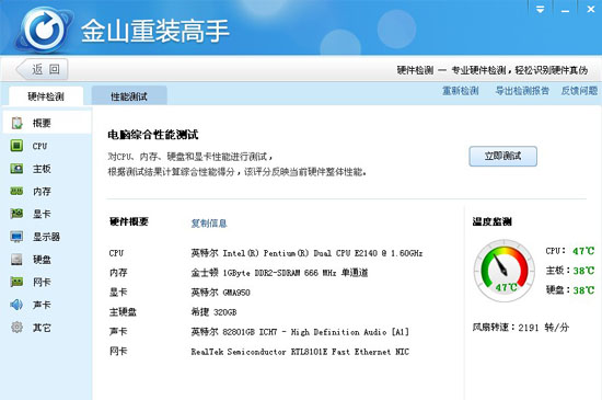 其實金山衛士中也有溫度監測功能,在百寶箱中的軟件工具里有硬件檢測這個功能,它不僅可以檢測系統的硬件信息,還可以監控CPU、硬盤、顯卡、主板等的溫度,如果你有安裝金山衛士可以把這個功能利用起來。